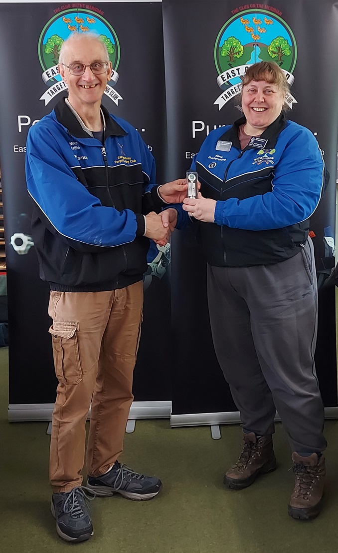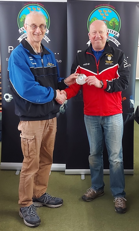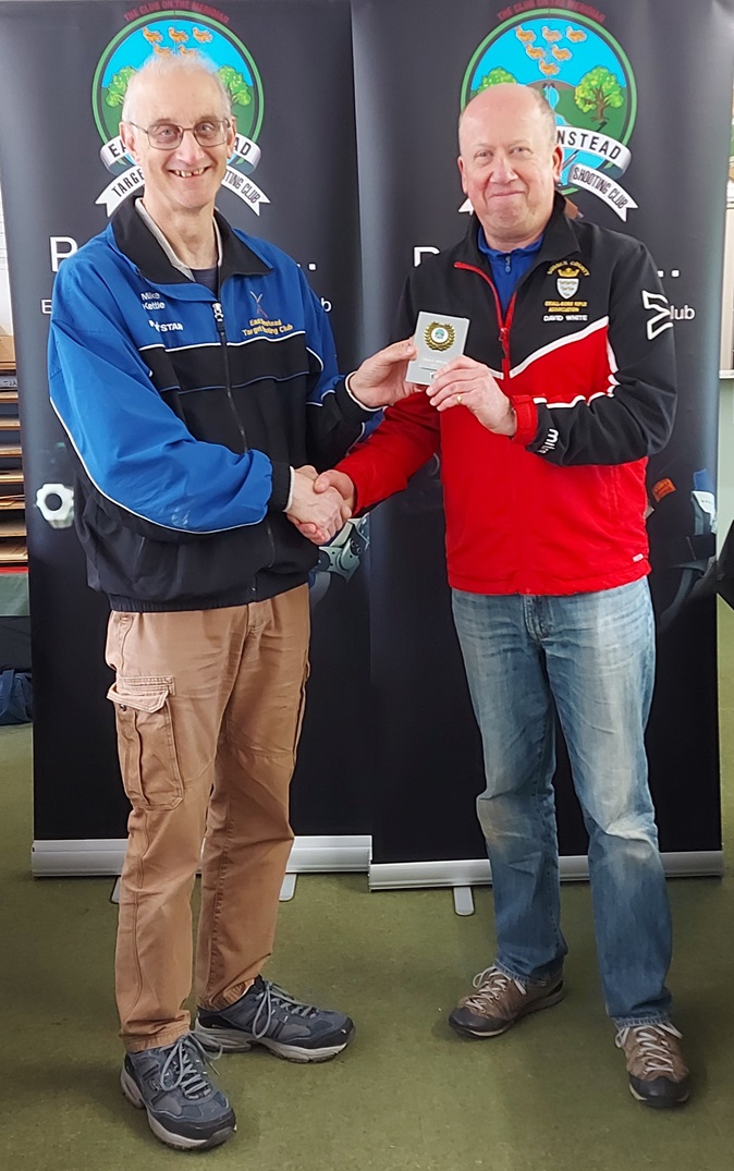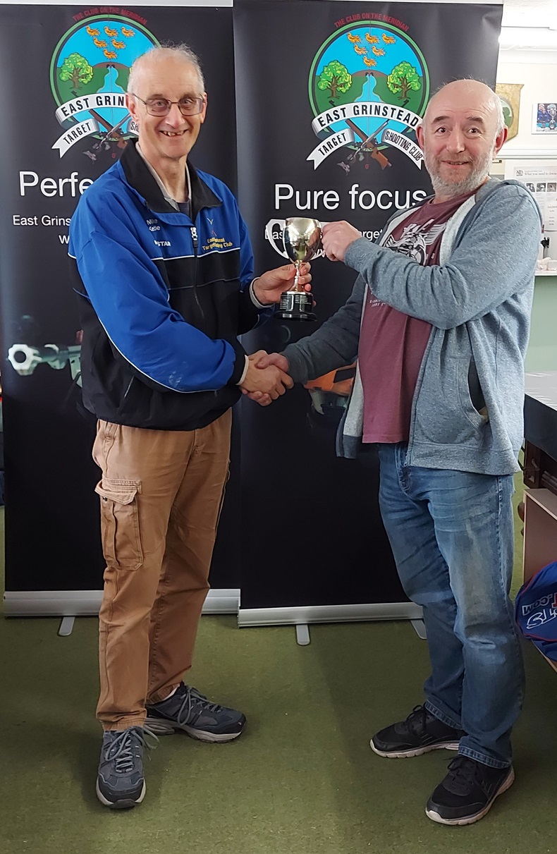 David White collecting Team of Three on behalf of himself, Malcolm Brain and Sara Marshall.C&D Pairs - Marie and Grant FeatherstoneOpen Pairs - Russell French and Hamish Matheson (Chichester)Veterans Cup - David White40 shots at 50m, Class D - Grant Featherstone40 shots at 50m, Class C - Keith Adair (Ashford & District)40 shots at 100yds, Class D -- Grant Featherstone40 shots at 100yds, Class B - Kevin Webb (Gally Hill Shooting Club)40 shots at 100yds, Class A - David WhiteOpen Dewar, Class D - Grant FeatherstoneOpen Dewar, Class B - Kevin Webb (Gally Hill Shooting Club)Open Dewar, Class A - David WhiteGrand Aggregate: 3rd, Class D - Marie FeatherstoneGrand Aggregate: 3rd, Class C - Jim HowardGrand Aggregate: 2nd, Class C - Keith Adair (Ashford & District)Grand Aggregate: 2nd, ClassB - Sue Adair (Ashford & District)Winner, Class D for the Graham Ford Trophy (+ Medal) - Grant FeatherstoneWinner, Class B for the The Rentokil Cup (+ Medal) - Kevin Webb (Gally Hill Shooting Club)Winner, Class A for the The Felbridge Bowl (+ Medal) - David White