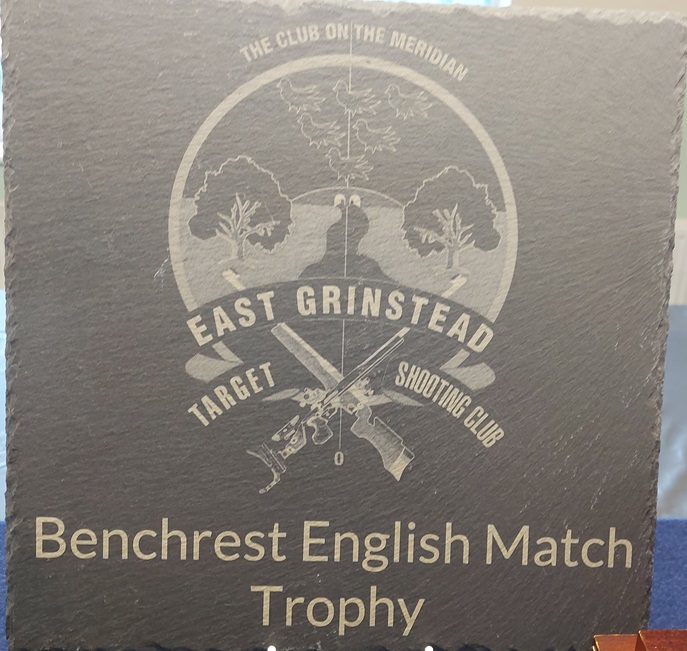 Prize display with the new benchrest trophies engraved on slate. (Image: Mike Kettle)