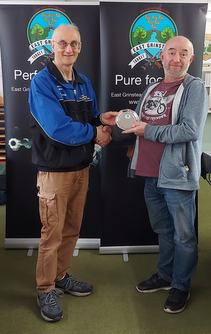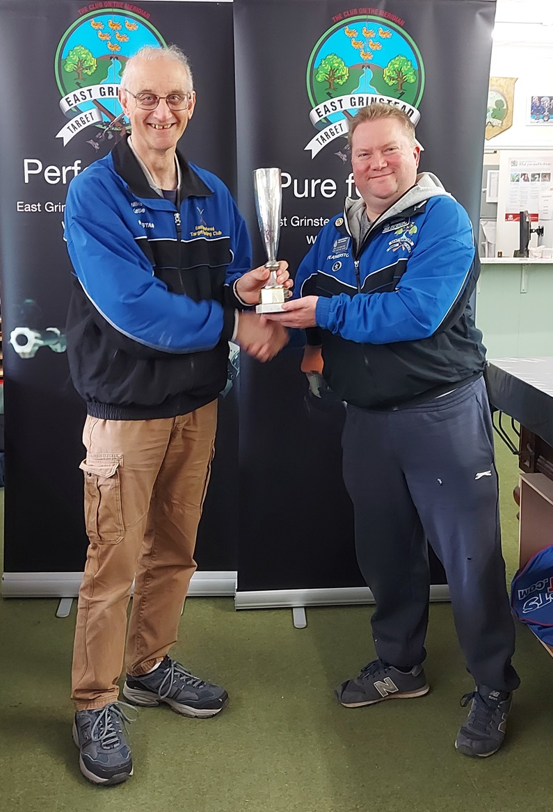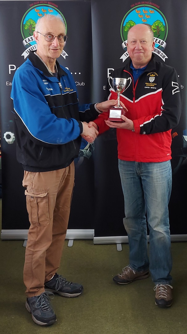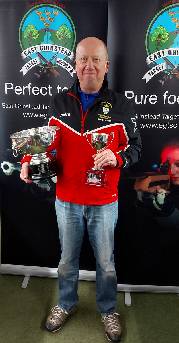 David White collecting Team of Three on behalf of himself, Malcolm Brain and Sara Marshall.C&D Pairs - Marie and Grant FeatherstoneOpen Pairs - Russell French and Hamish Matheson (Chichester)Veterans Cup - David White40 shots at 50m, Class D - Grant Featherstone40 shots at 50m, Class C - Keith Adair (Ashford & District)40 shots at 100yds, Class D -- Grant Featherstone40 shots at 100yds, Class B - Kevin Webb (Gally Hill Shooting Club)40 shots at 100yds, Class A - David WhiteOpen Dewar, Class D - Grant FeatherstoneOpen Dewar, Class B - Kevin Webb (Gally Hill Shooting Club)Open Dewar, Class A - David WhiteGrand Aggregate: 3rd, Class D - Marie FeatherstoneGrand Aggregate: 3rd, Class C - Jim HowardGrand Aggregate: 2nd, Class C - Keith Adair (Ashford & District)Grand Aggregate: 2nd, ClassB - Sue Adair (Ashford & District)Winner, Class D for the Graham Ford Trophy (+ Medal) - Grant FeatherstoneWinner, Class B for the The Rentokil Cup (+ Medal) - Kevin Webb (Gally Hill Shooting Club)Winner, Class A for the The Felbridge Bowl (+ Medal) - David White