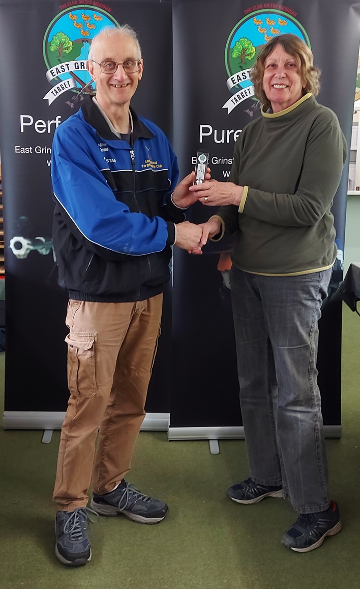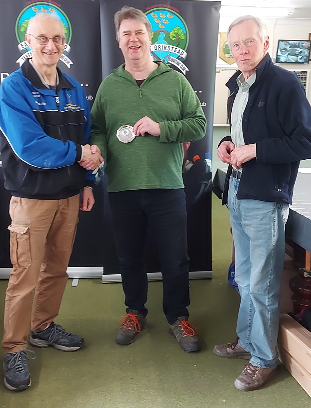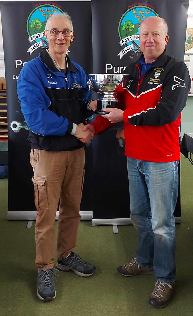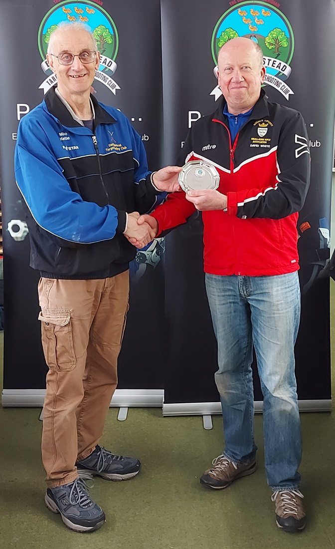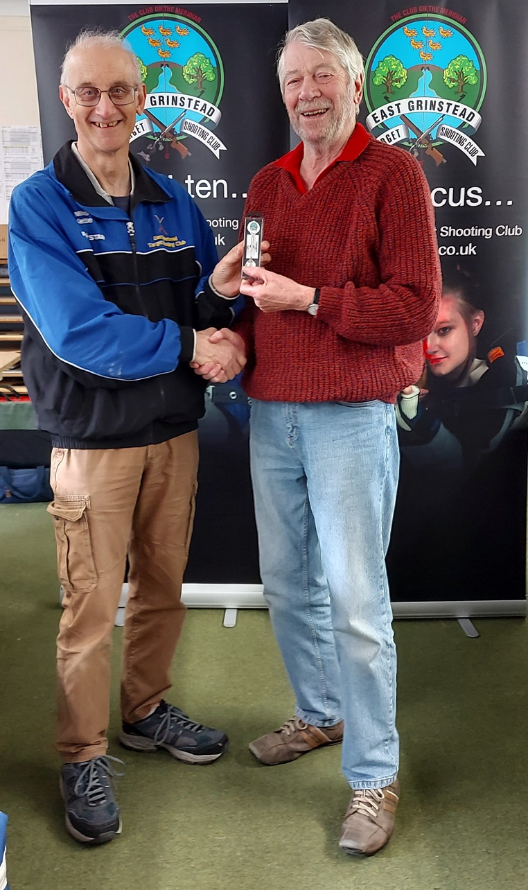 David White collecting Team of Three on behalf of himself, Malcolm Brain and Sara Marshall.C&D Pairs - Marie and Grant FeatherstoneOpen Pairs - Russell French and Hamish Matheson (Chichester)Veterans Cup - David White40 shots at 50m, Class D - Grant Featherstone40 shots at 50m, Class C - Keith Adair (Ashford & District)40 shots at 100yds, Class D -- Grant Featherstone40 shots at 100yds, Class B - Kevin Webb (Gally Hill Shooting Club)40 shots at 100yds, Class A - David WhiteOpen Dewar, Class D - Grant FeatherstoneOpen Dewar, Class B - Kevin Webb (Gally Hill Shooting Club)Open Dewar, Class A - David WhiteGrand Aggregate: 3rd, Class D - Marie FeatherstoneGrand Aggregate: 3rd, Class C - Jim HowardGrand Aggregate: 2nd, Class C - Keith Adair (Ashford & District)Grand Aggregate: 2nd, ClassB - Sue Adair (Ashford & District)Winner, Class D for the Graham Ford Trophy (+ Medal) - Grant FeatherstoneWinner, Class B for the The Rentokil Cup (+ Medal) - Kevin Webb (Gally Hill Shooting Club)Winner, Class A for the The Felbridge Bowl (+ Medal) - David White