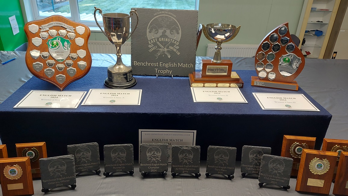 Prize display with the new benchrest trophies engraved on slate. (Image: Mike Kettle)