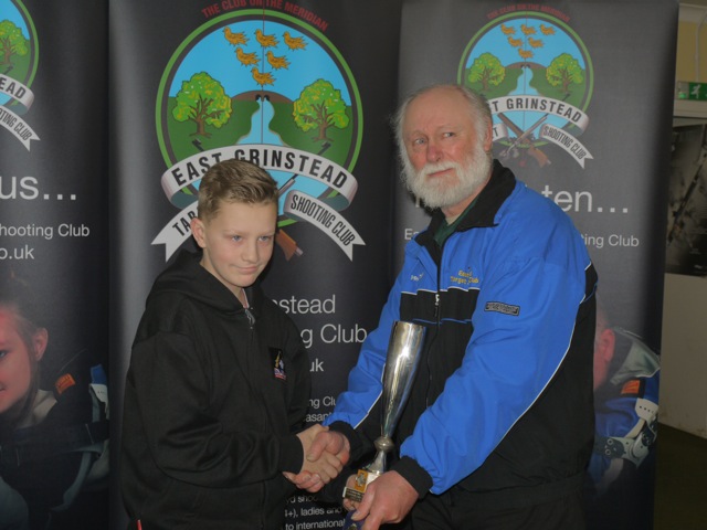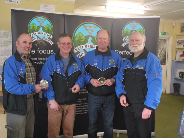 The Spring Open Shoot at the East Grinstead Target Shooting Club saw some high scores posted by 50 competitors of all ages and abilities over the weekend. Shooters from ten Clubs in the South East enjoyed some challenging conditions at 50m and 100 yards, varying from light winds and sunshine to blustery rain. Top shooter on the day winning Class A was Michael Dowe of St Nicholas who dropped just 16 points ex 800 just 4 points ahead of Peter Terry of Fittleworth. East Grinstead benefited from good team shooting from Andy Meyers, Malcolm Brain and David White by winning the Team of Three competition; while Elaine Kettle won the Open Dewar and Stephen Dryburgh achieved the highest score for 40 shots at 100 yards in Class D. Juniors from Aldingbourne did very well with Joe Newington winning the Juniors' Dewar and Scott Strotten winning Class D overall.